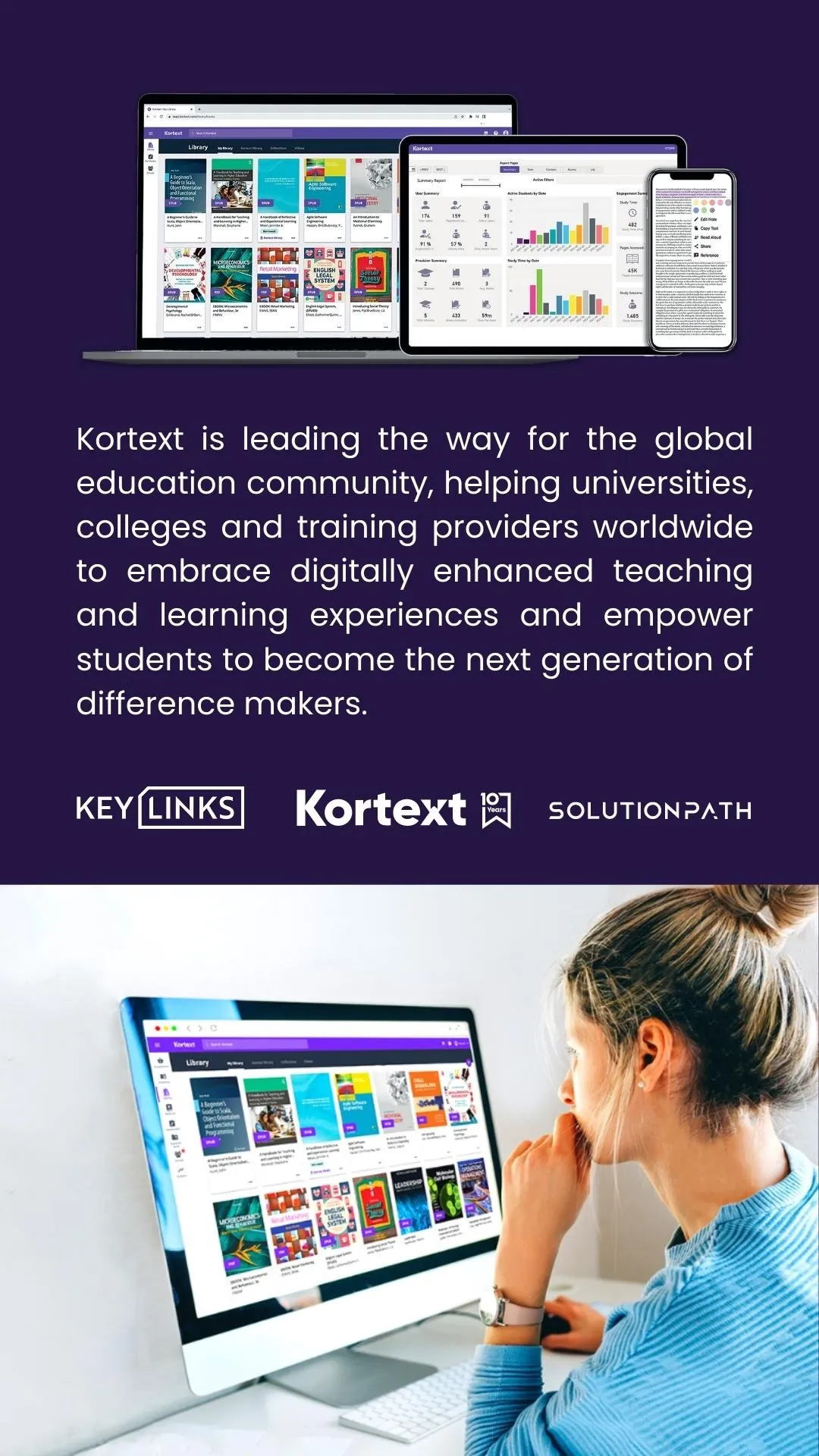 Kortext is a global leader in digital learning and student engagement solutions within higher education. Our smart study platform, Arcturus, gives institutions and their students a gateway to five million eBooks and digital resources from over 4,700 publishers. In a significant enhancement of the Arcturus platform, Kortext has partnered with Microsoft to launch Kortext Premium – a suite of next-generation AI-powered study tools, leveraging the capabilities of GPT-based technologies on trusted, institution-approved content. For more information, please visit: kortext.com.